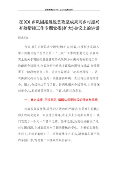 【七哥公文】2025年:【七哥公文】在XX乡巩固拓展脱贫攻坚成果同乡村振兴有效衔接工作专题党委(扩大)会议上的讲话+更多免费公文+VX:QiGeGongWen2024+更多免费公文+VX:QiGeGongWen2024