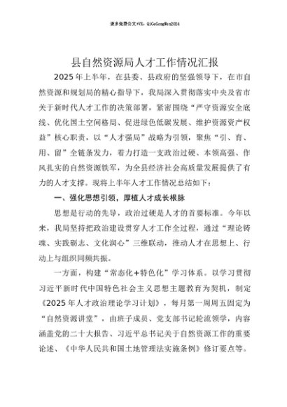 【七哥公文】2025年:【七哥公文】县自然资源局人才工作情况汇报+更多免费公文+VX:QiGeGongWen2024+更多免费公文+VX:QiGeGongWen2024