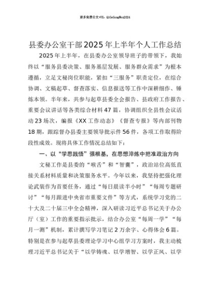 【七哥公文】2025年:【七哥公文】县委办公室干部2025年上半年个人工作总结+更多免费公文+VX:QiGeGongWen2024+更多免费公文+VX:QiGeGongWen2024