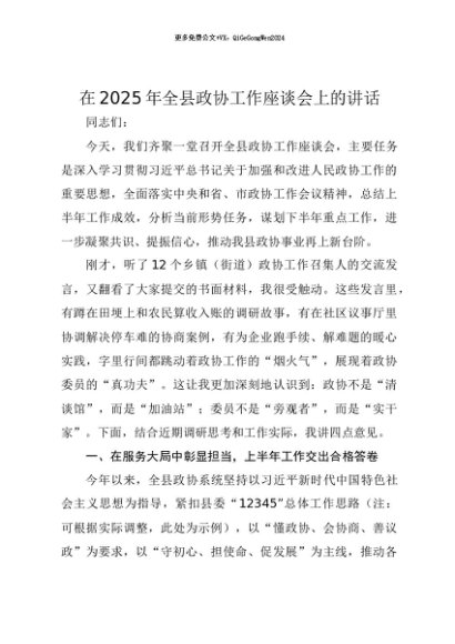 【七哥公文】2025年:【七哥公文】在2025年全县政协工作座谈会上的讲话+更多免费公文+VX:QiGeGongWen2024+更多免费公文+VX:QiGeGongWen2024