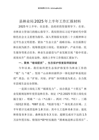 【七哥公文】2025年:【七哥公文】县林业局2025年上半年工作汇报材料+更多免费公文+VX:QiGeGongWen2024+更多免费公文+VX:QiGeGongWen2024