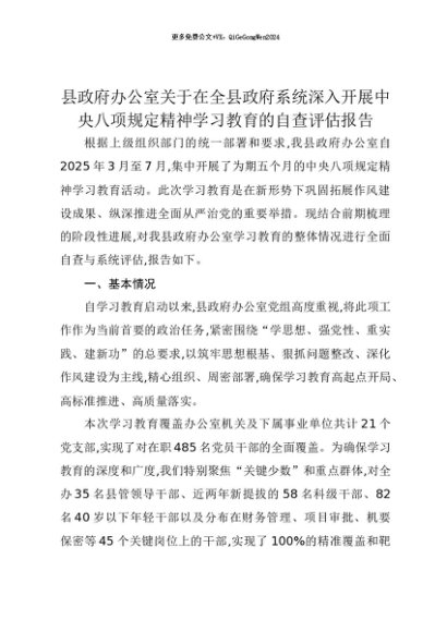 【七哥公文】2025年:【七哥公文】县政府办公室关于在全县政府系统深入开展中央八项规定精神学习教育的自查评估报告+更多免费公文+VX:QiGeGongWen2024+更多免费公文+VX:QiGeGongWen2024
