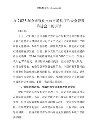 【七哥公文】2025年:【七哥公文】在2025年全市强化文旅市场秩序和安全管理推进会上的讲话+更多免费公文+VX:QiGeGongWen2024+更多免费公文+VX:QiGeGongWen2024
