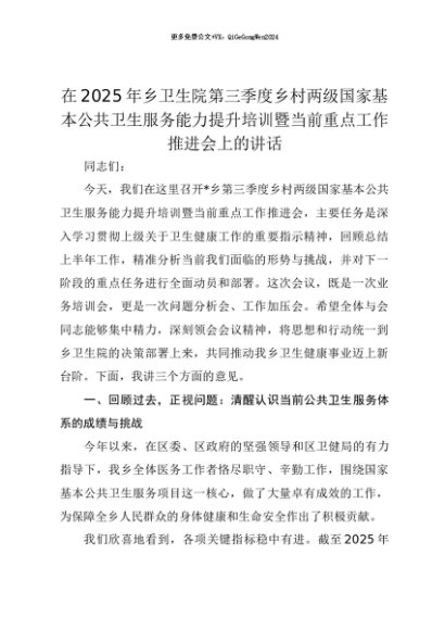 【七哥公文】2025年:【七哥公文】在2025年乡卫生院第三季度乡村两级国家基本公共卫生服务能力提升培训暨当前重点工作推进会上的讲话+更多免费公文+VX:QiGeGongWen2024+更多免费公文+VX:QiGeGongWen2024