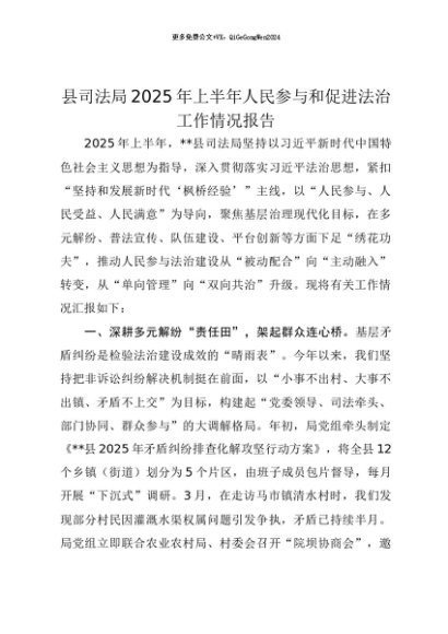 【七哥公文】2025年:【七哥公文】县司法局2025年上半年人民参与和促进法治工作情况报告+更多免费公文+VX:QiGeGongWen2024+更多免费公文+VX:QiGeGongWen2024