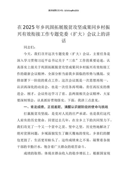 【七哥公文】2025年:【七哥公文】在2025年乡巩固拓展脱贫攻坚成果同乡村振兴有效衔接工作专题党委(扩大)会议上的讲话+更多免费公文+VX:QiGeGongWen2024+更多免费公文+VX:QiGeGongWen2024