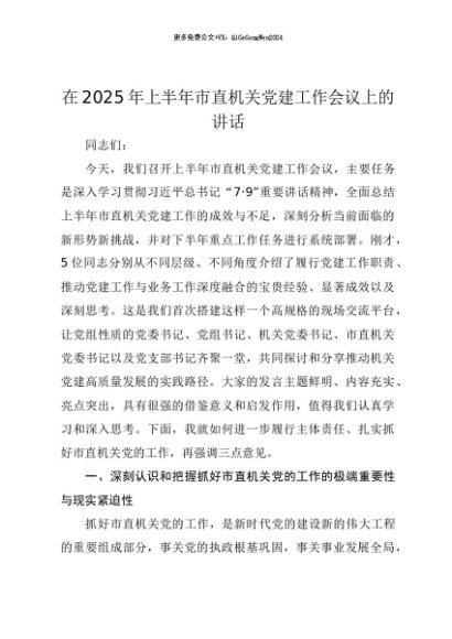 【七哥公文】2025年:【七哥公文】在2025年上半年市直机关党建工作会议上的讲话+更多免费公文+VX:QiGeGongWen2024+更多免费公文+VX:QiGeGongWen2024