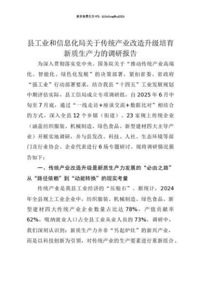【七哥公文】2025年:【七哥公文】县工业和信息化局关于传统产业改造升级培育新质生产力的调研报告+更多免费公文+VX:QiGeGongWen2024+更多免费公文+VX:QiGeGongWen2024