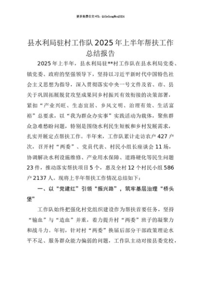 【七哥公文】2025年:【七哥公文】县水利局驻村工作队2025年上半年帮扶工作总结报告+更多免费公文+VX:QiGeGongWen2024+更多免费公文+VX:QiGeGongWen2024