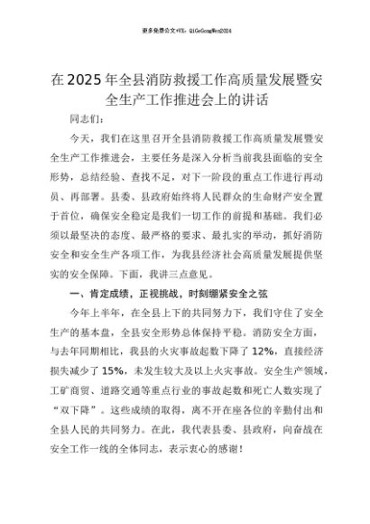 【七哥公文】2025年:【七哥公文】在2025年全县消防救援工作高质量发展暨安全生产工作推进会上的讲话+更多免费公文+VX:QiGeGongWen2024+更多免费公文+VX:QiGeGongWen2024
