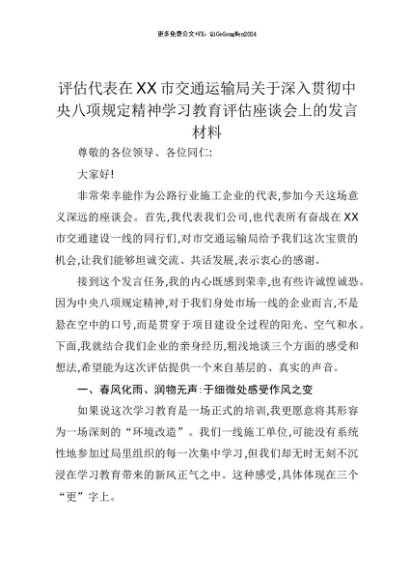 【七哥公文】2025年:【七哥公文】评估代表在XX市交通运输局关于深入贯彻中央八项规定精神学习教育评估座谈会上的发言材料+更多免费公文+VX:QiGeGongWen2024+更多免费公文+VX:QiGeGongWen2024