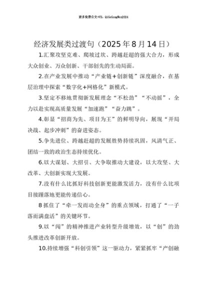 【七哥公文】2025年:【七哥公文】经济发展类过渡句(2025年8月14日)+更多免费公文+VX:QiGeGongWen2024+更多免费公文+VX:QiGeGongWen2024