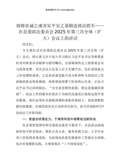 【七哥公文】2025年:【七哥公文】熔铸忠诚之魂 夯实平安之基 锻造政法铁军——在县委政法委员会2025年第三次全体(扩大)会议上的讲话+更多免费公文+VX:QiGeGongWen2024+更多免费公文+VX:QiGeGongWen2024