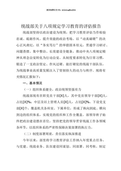 【七哥公文】2025年:【七哥公文】统战部关于贯彻中央八项规定精神学习教育的评估报告+更多免费公文+VX:QiGeGongWen2024+更多免费公文+VX:QiGeGongWen2024
