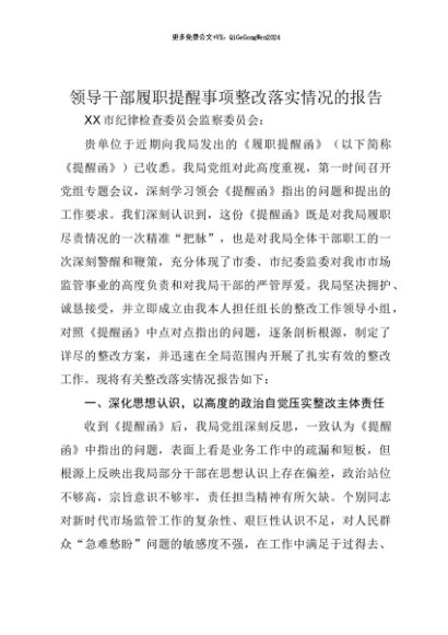 【七哥公文】2025年:【七哥公文】领导干部履职提醒事项整改落实情况的报告+更多免费公文+VX:QiGeGongWen2024+更多免费公文+VX:QiGeGongWen2024