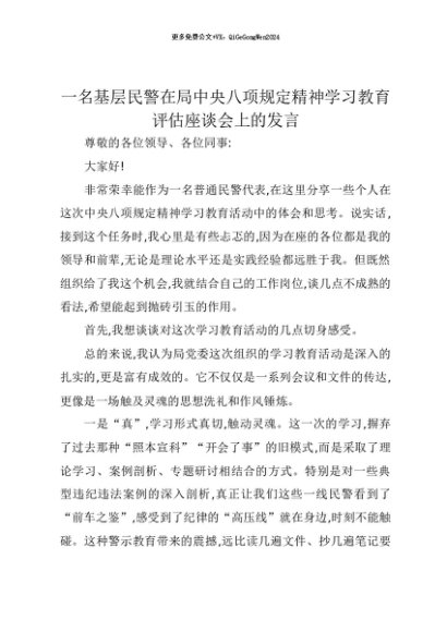 【七哥公文】2025年:【七哥公文】一名基层民警在局中央八项规定精神学习教育评估座谈会上的发言+更多免费公文+VX:QiGeGongWen2024+更多免费公文+VX:QiGeGongWen2024