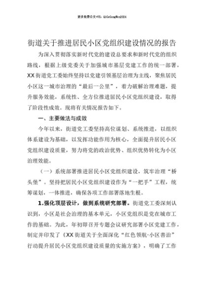 【七哥公文】2025年:【七哥公文】街道关于推进居民小区党组织建设情况的报告+更多免费公文+VX:QiGeGongWen2024+更多免费公文+VX:QiGeGongWen2024