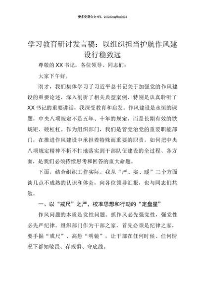 【七哥公文】2025年:【七哥公文】贯彻中央八项规定精神学习教育研讨发言稿:以组织担当护航作风建设行稳致远+更多免费公文+VX:QiGeGongWen2024+更多免费公文+VX:QiGeGongWen2024
