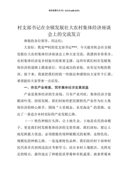 【七哥公文】2025年:【七哥公文】村支部书记在全镇发展壮大农村集体经济座谈会上的交流发言+更多免费公文+VX:QiGeGongWen2024+更多免费公文+VX:QiGeGongWen2024