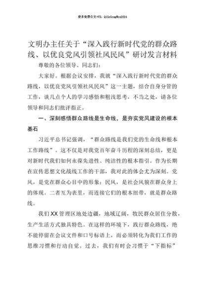 【七哥公文】2025年:【七哥公文】文明办主任关于“深入践行新时代党的群众路线、以优良党风引领社风民风”研讨发言材料+更多免费公文+VX:QiGeGongWen2024+更多免费公文+VX:QiGeGongWen2024