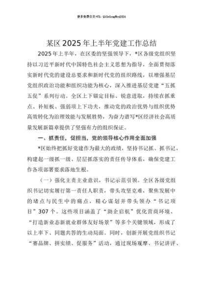 【七哥公文】2025年:【七哥公文】某区2025年上半年党建工作总结+更多免费公文+VX:QiGeGongWen2024+更多免费公文+VX:QiGeGongWen2024