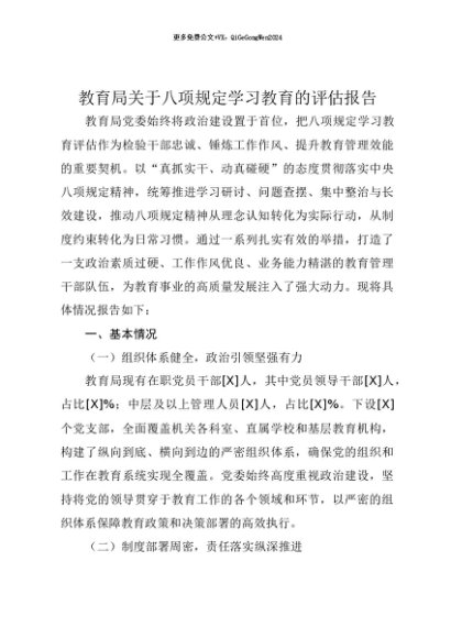 【七哥公文】2025年:【七哥公文】教育局关于贯彻中央八项规定精神学习教育的评估报告+更多免费公文+VX:QiGeGongWen2024+更多免费公文+VX:QiGeGongWen2024