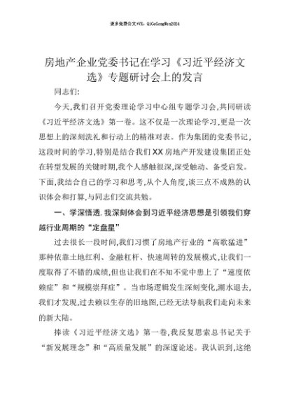 【七哥公文】2025年:【七哥公文】房地产企业党委书记在学习《习近平经济文选》专题研讨会上的发言+更多免费公文+VX:QiGeGongWen2024+更多免费公文+VX:QiGeGongWen2024