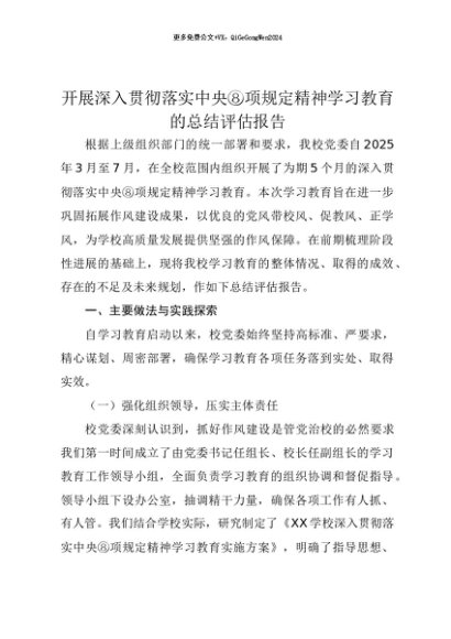 【七哥公文】2025年:【七哥公文】开展深入贯彻落实中央八项规定精神学习教育的总结评估报告+更多免费公文+VX:QiGeGongWen2024+更多免费公文+VX:QiGeGongWen2024