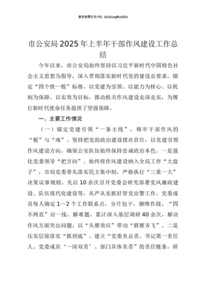 【七哥公文】2025年:【七哥公文】市公安局2025年上半年干部作风建设工作总结+更多免费公文+VX:QiGeGongWen2024+更多免费公文+VX:QiGeGongWen2024