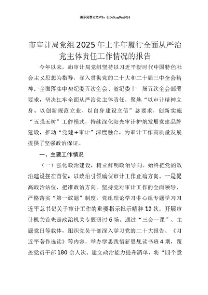 【七哥公文】2025年:【七哥公文】市审计局党组2025年上半年履行全面从严治党主体责任工作情况的报告+更多免费公文+VX:QiGeGongWen2024+更多免费公文+VX:QiGeGongWen2024