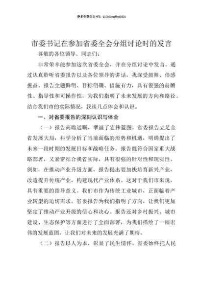 【七哥公文】2025年:【七哥公文】市委书记在参加省委全会分组讨论时的发言+更多免费公文+VX:QiGeGongWen2024+更多免费公文+VX:QiGeGongWen2024