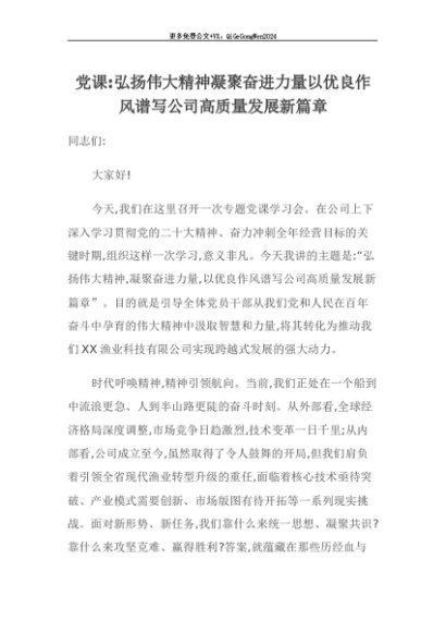 【七哥公文】2025年:【七哥公文】党课讲稿:弘扬伟大精神凝聚奋进力量以优良作风谱写公司高质量发展新篇章+更多免费公文+VX:QiGeGongWen2024+更多免费公文+VX:QiGeGongWen2024