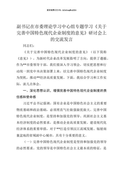 【七哥公文】2025年:【七哥公文】副书记在市委理论学习中心组专题学习《关于完善中国特色现代企业制度的意见》研讨会上的交流发言+更多免费公文+VX:QiGeGongWen2024+更多免费公文+VX:QiGeGongWen2024