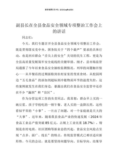 【七哥公文】2025年:【七哥公文】副县长在全县食品安全领域专项整治工作会上的讲话+更多免费公文+VX:QiGeGongWen2024+更多免费公文+VX:QiGeGongWen2024