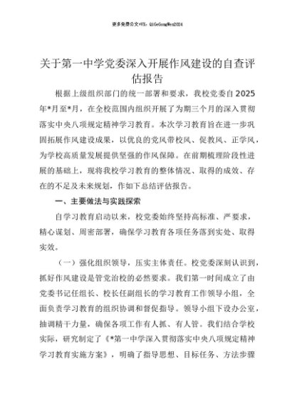 【七哥公文】2025年:【七哥公文】关于第一中学党委深入开展作风建设的自查评估报告+更多免费公文+VX:QiGeGongWen2024+更多免费公文+VX:QiGeGongWen2024