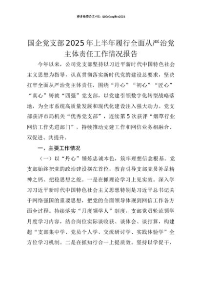 【七哥公文】2025年:【七哥公文】国企党支部2025年上半年履行全面从严治党主体责任工作情况报告+更多免费公文+VX:QiGeGongWen2024+更多免费公文+VX:QiGeGongWen2024