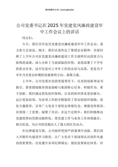 【七哥公文】2025年:【七哥公文】公司党委书记在2025年党建党风廉政建设年中工作会议上的讲话+更多免费公文+VX:QiGeGongWen2024+更多免费公文+VX:QiGeGongWen2024