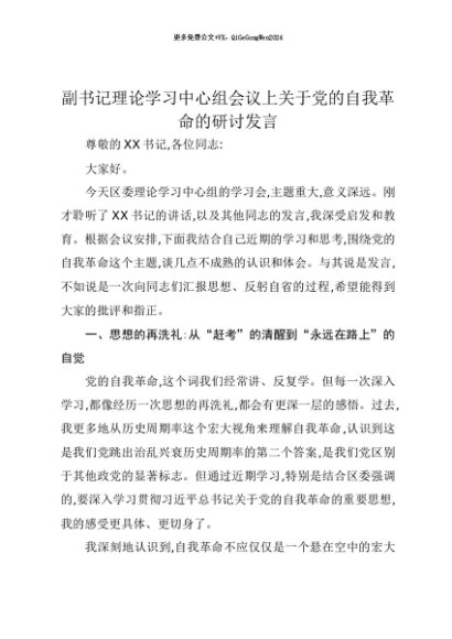 【七哥公文】2025年:【七哥公文】副书记理论学习中心组会议上关于党的自我革命的研讨发言+更多免费公文+VX:QiGeGongWen2024+更多免费公文+VX:QiGeGongWen2024