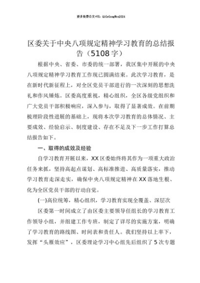 【七哥公文】2025年:【七哥公文】区委关于中央八项规定精神学习教育的总结报告(5108字)+更多免费公文+VX:QiGeGongWen2024+更多免费公文+VX:QiGeGongWen2024
