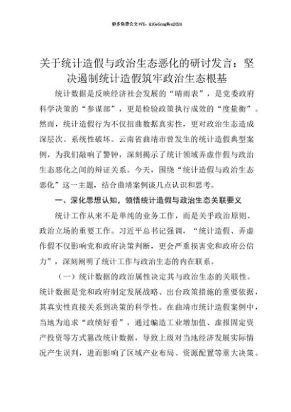 【七哥公文】2025年:【七哥公文】关于统计造假与政治生态恶化的研讨发言:坚决遏制统计造假筑牢政治生态根基+更多免费公文+VX:QiGeGongWen2024+更多免费公文+VX:QiGeGongWen2024
