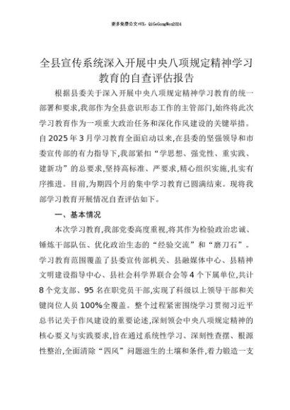 【七哥公文】2025年:【七哥公文】全县宣传系统深入开展中央八项规定精神学习教育的自查评估报告+更多免费公文+VX:QiGeGongWen2024+更多免费公文+VX:QiGeGongWen2024