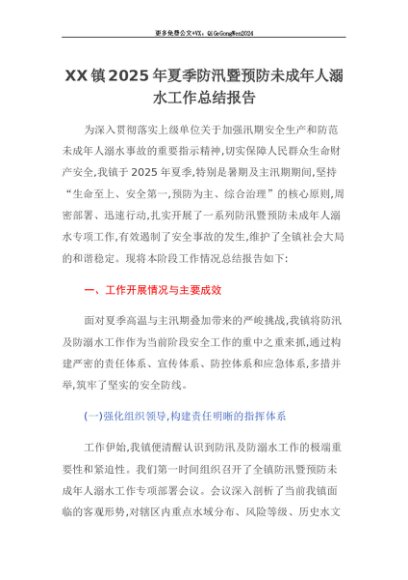 【七哥公文】2025年:【七哥公文】XX镇2025年夏季防汛暨预防未成年人溺水工作总结报告+更多免费公文+VX:QiGeGongWen2024+更多免费公文+VX:QiGeGongWen2024