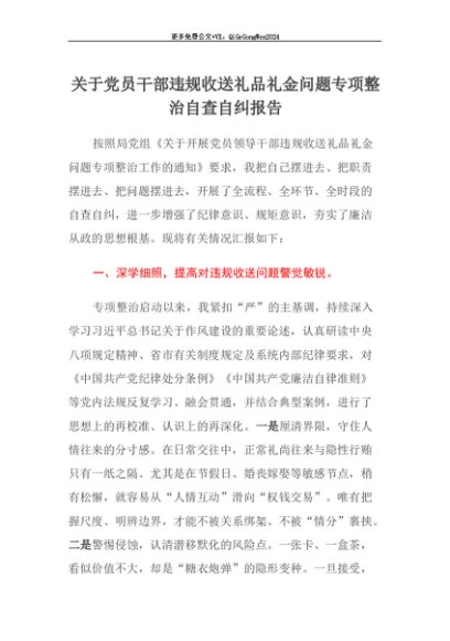 【七哥公文】2025年:【七哥公文】关于党员干部违规收送礼品礼金问题专项整治自查自纠报告+更多免费公文+VX:QiGeGongWen2024+更多免费公文+VX:QiGeGongWen2024