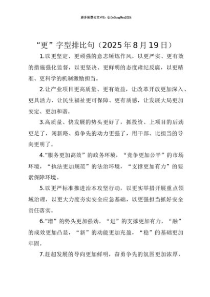【七哥公文】2025年:【七哥公文】“更”字型排比句(2025年8月19日)+更多免费公文+VX:QiGeGongWen2024+更多免费公文+VX:QiGeGongWen2024