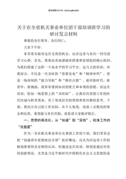 【七哥公文】2025年:【七哥公文】关于在全省机关事业单位团干部培训班学习的研讨发言材料+更多免费公文+VX:QiGeGongWen2024+更多免费公文+VX:QiGeGongWen2024