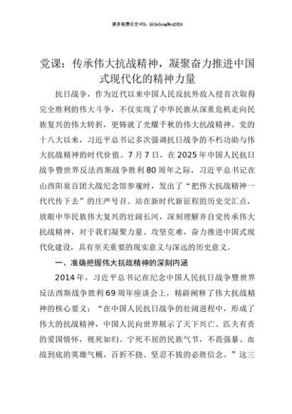 【七哥公文】2025年:【七哥公文】党课讲稿:传承伟大抗战精神,凝聚奋力推进中国式现代化的精神力量+更多免费公文+VX:QiGeGongWen2024+更多免费公文+VX:QiGeGongWen2024