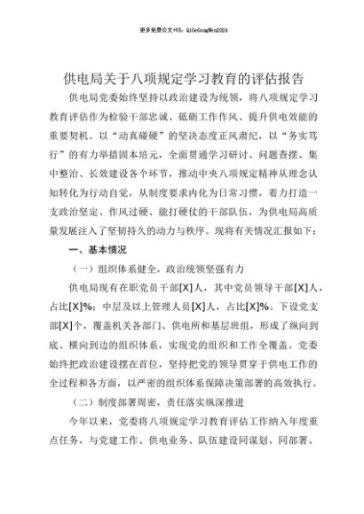 【七哥公文】2025年:【七哥公文】供电局关于贯彻中央八项规定精神学习教育的评估报告+更多免费公文+VX:QiGeGongWen2024+更多免费公文+VX:QiGeGongWen2024