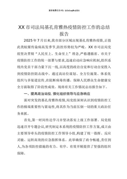 【七哥公文】2025年:【七哥公文】XX市司法局基孔肯雅热疫情防控工作的总结报告+更多免费公文+VX:QiGeGongWen2024+更多免费公文+VX:QiGeGongWen2024