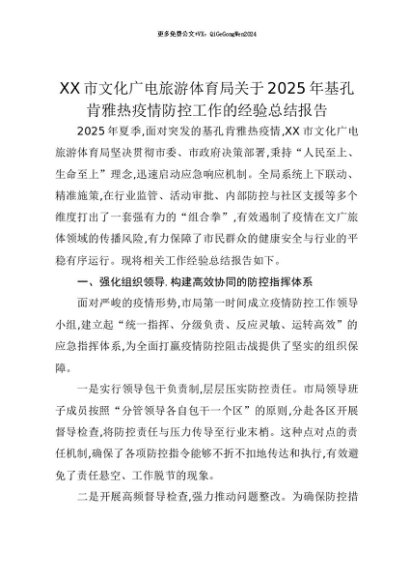 【七哥公文】2025年:【七哥公文】XX市文化广电旅游体育局关于2025年基孔肯雅热疫情防控工作的经验总结报告+更多免费公文+VX:QiGeGongWen2024+更多免费公文+VX:QiGeGongWen2024