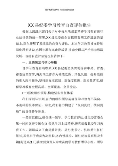 【七哥公文】2025年:【七哥公文】XX县纪委贯彻中央八项规定精神学习教育自查评估报告+更多免费公文+VX:QiGeGongWen2024+更多免费公文+VX:QiGeGongWen2024